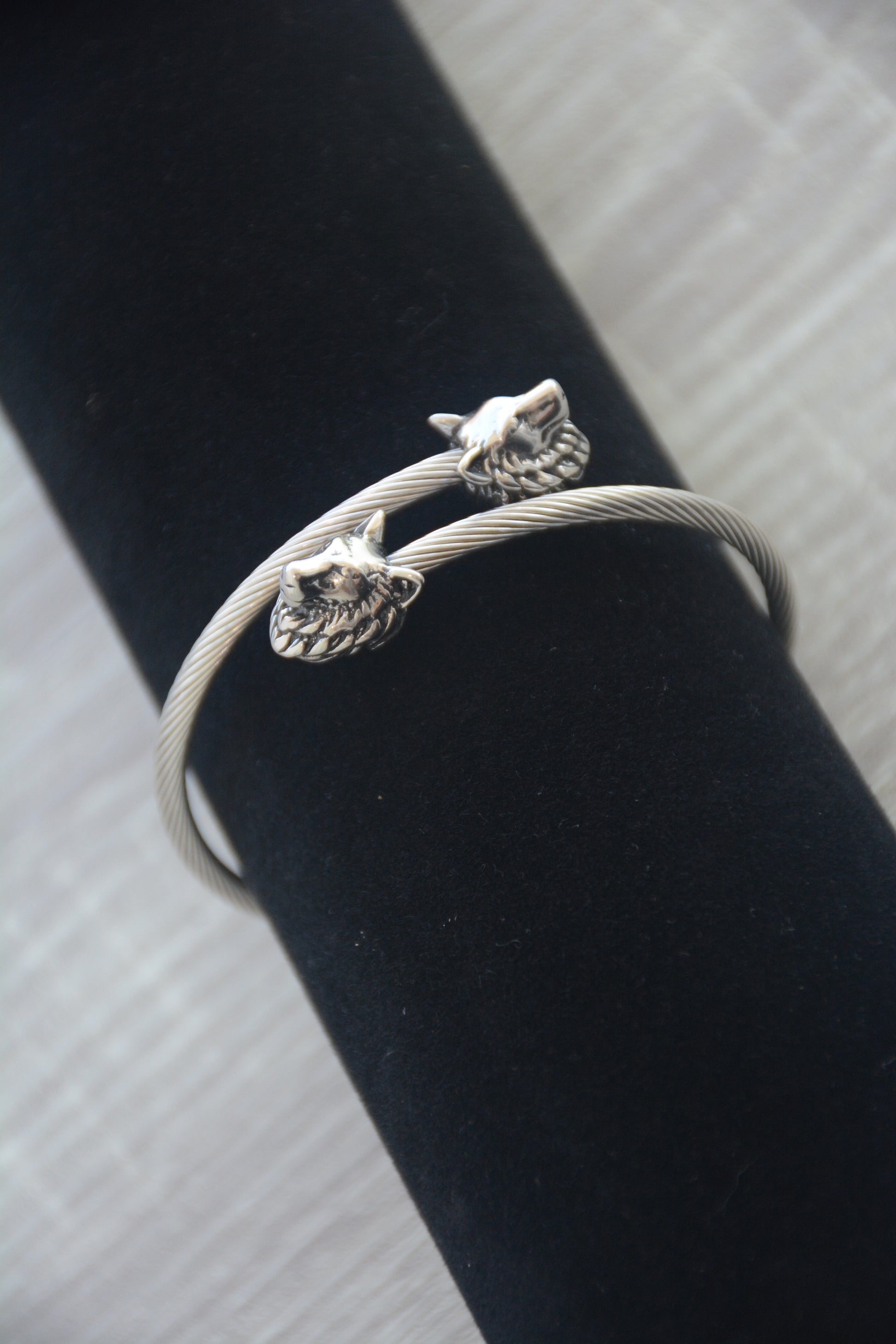 Diseñado en acero de alta resistencia con baño de plata italiana, su acabado silver refleja la luz con una presencia imponente. Las formas talladas de los lobos son un tributo al guerrero que vive dentro, al protector, al que no le teme a la oscuridad… porque la domina.