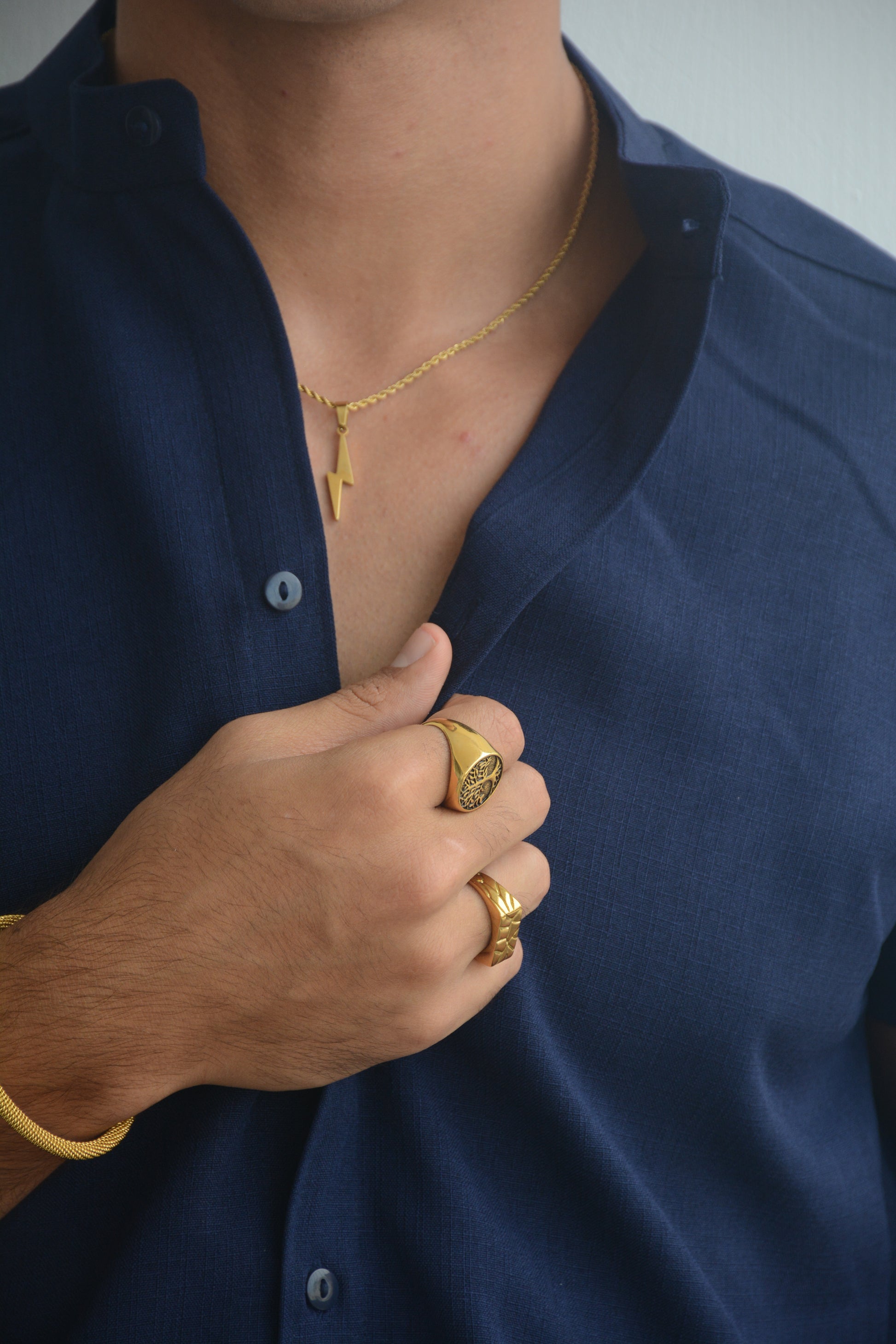 Su dije en forma de rayo encapsula decisión, rapidez mental y transformación. Forjada en acero inoxidable con baño de oro italiano, y sostenida por una cadena de tejido italiano, su diseño combina potencia y elegancia con una precisión impecable.