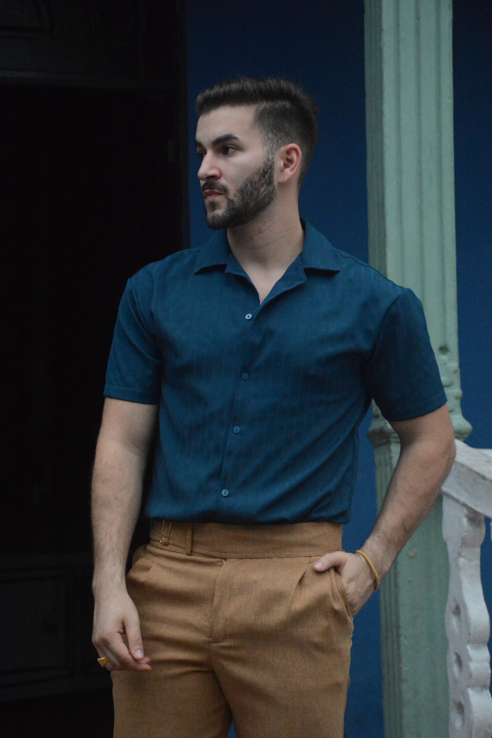 Confeccionada en tejido premium de alta estructura, la Alba Navy presenta un cuello de solapa impecable, botones minimalistas y un ajuste regular que crea una silueta limpia, moderna y poderosa. Es una prenda diseñada para hombres que valoran la excelencia en cada detalle.