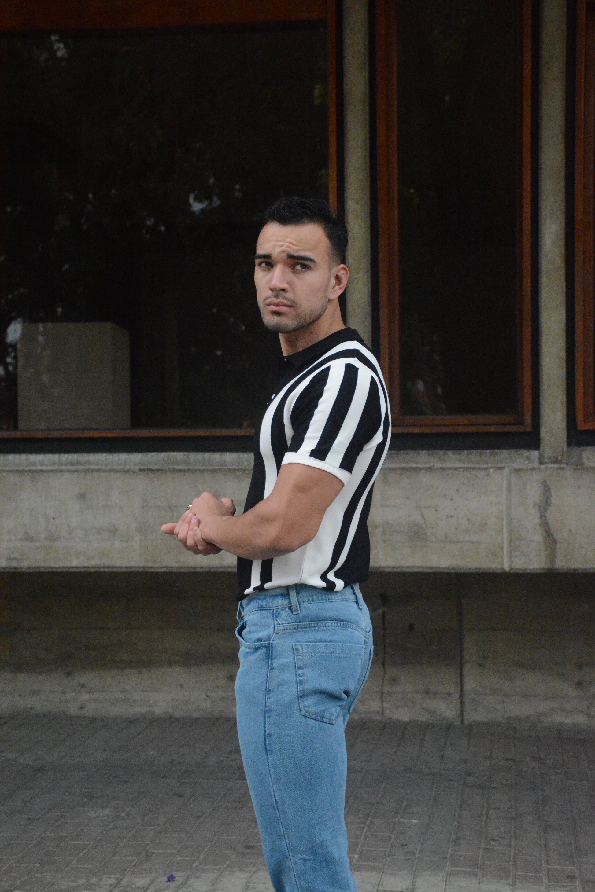 Su color negro profundo, realzado con franjas blancas estratégicas, genera un contraste elegante y visualmente poderoso, mientras que la botonería frontal de diseño refinado aporta carácter y sofisticación. El ajuste estilizado del polo realza hombros, torso y espalda, ofreciendo un look impecable y versátil para cualquier ocasión.